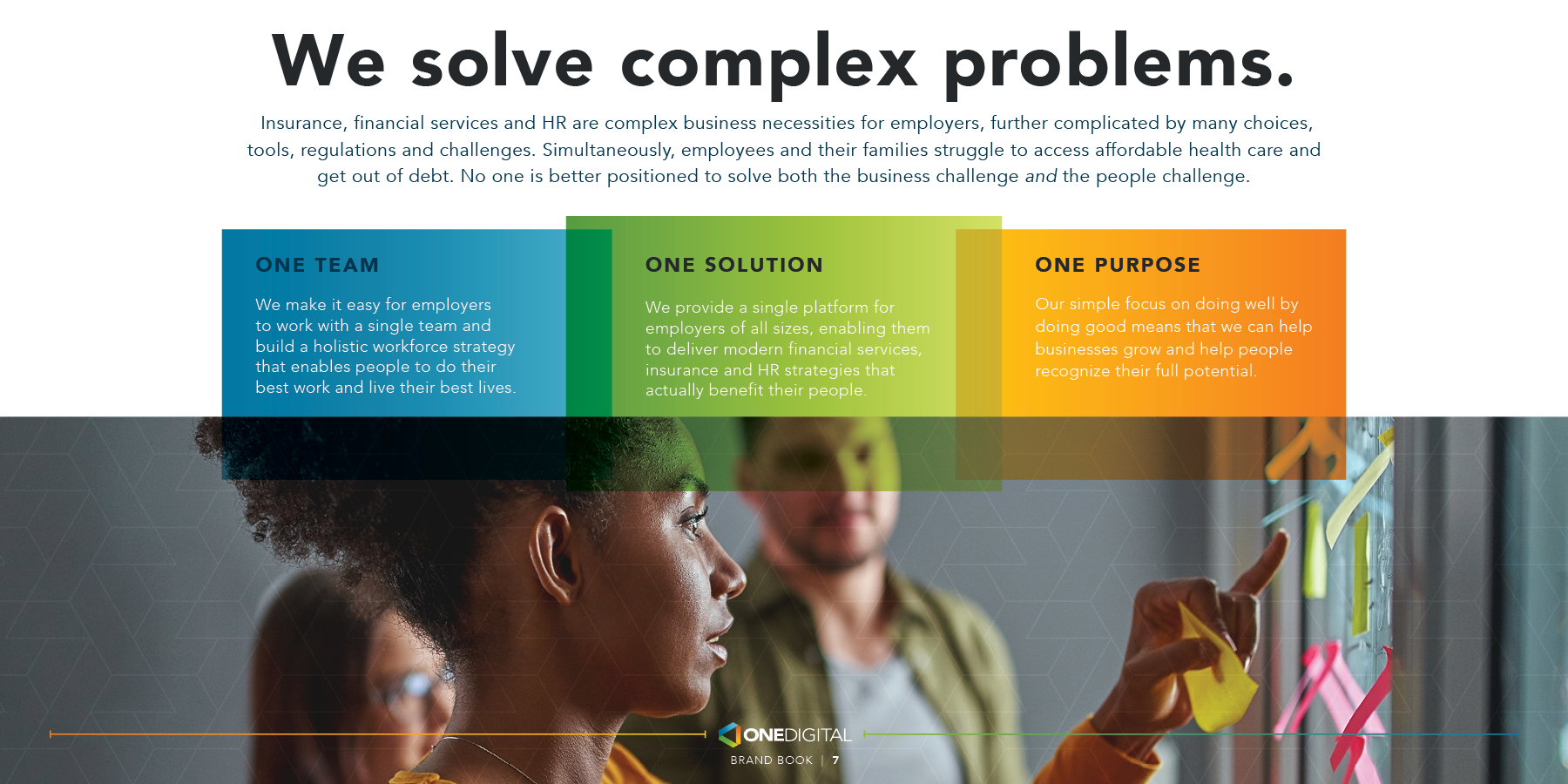 In its 20 years of existence, there had never been one document that outlined the full brand story. How could new hires easily understand who we are and how we show up for our customers? How could prospective acquisitions know if our cultures truly aligned before signing the deal? How could we develop one single source of truth that contained a visually beautiful and authentically told story of the OneDigital brand that could be easily shared and distributed?